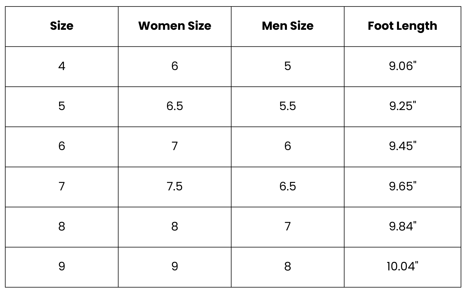 Size Chart (inches):